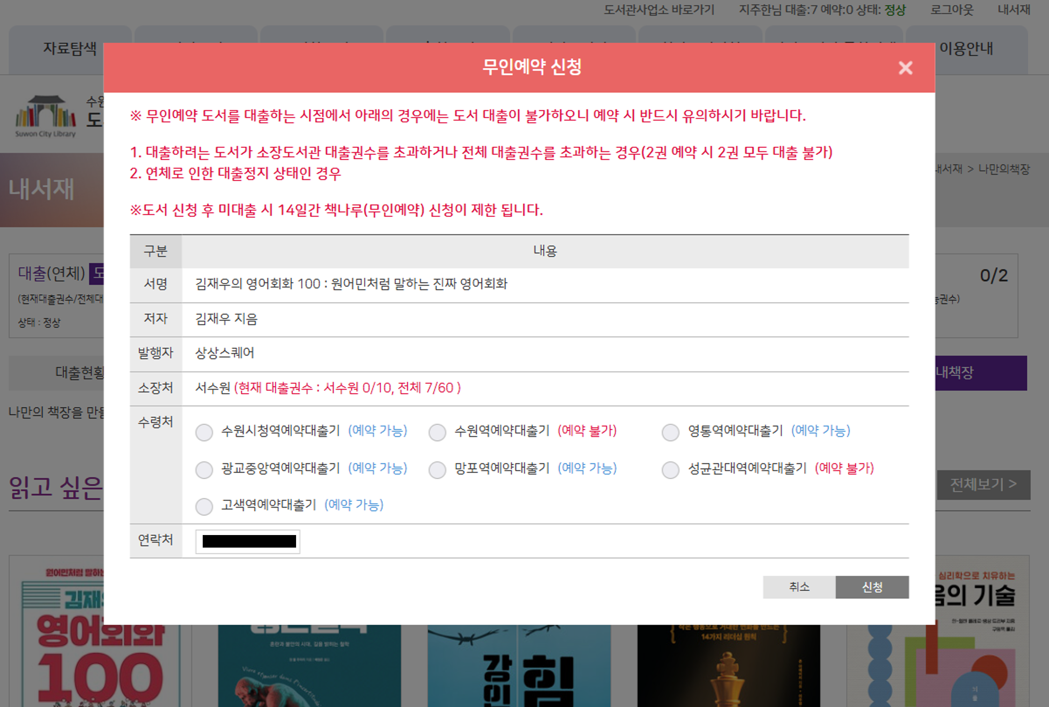 Tip: 인기 베스트셀러나 신간은 예약 대기자가 많아 바로 신청이 어려울 수 있으니, 미리 검색하여 대기 순서를 확인하는 것이 좋습니다.