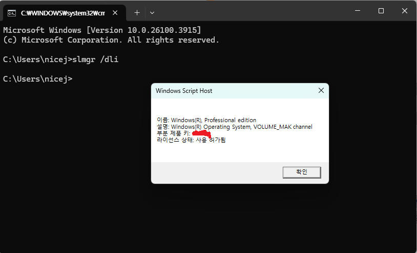 🔑 제품 키 확인 방법 (일부만 표시됨)